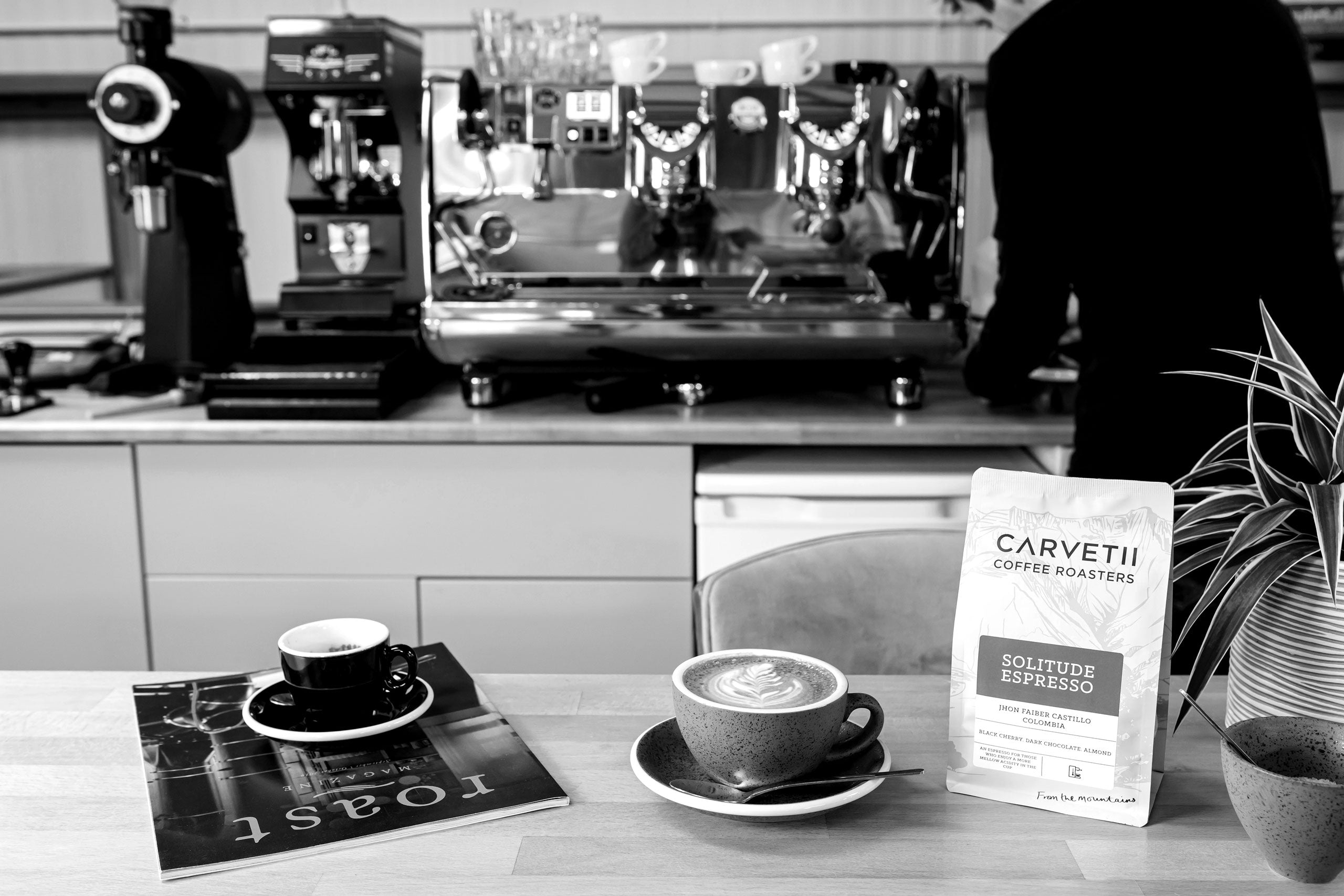 Our Solitude Espresso uses coffees with a naturally lower acidity and often tends towards a more chocolate and nut profile. Again in milk the character is smooth and sweet.
